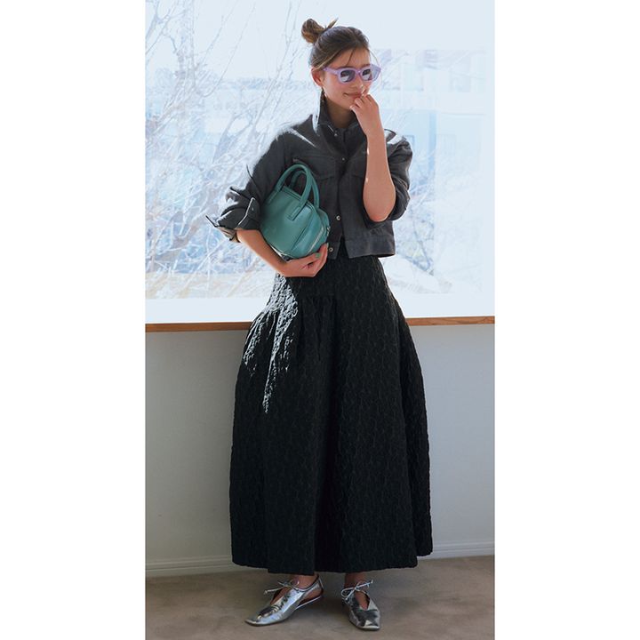 構築的フォルムのスカートに 短丈ジャケットでメリハリ。 メタリックの足元でモード感を