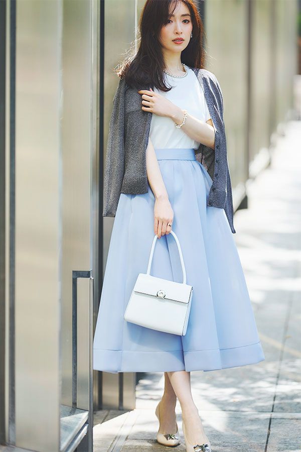 軽やかなタフタ素材のフレアでワンツーコーデをリフレッシュ