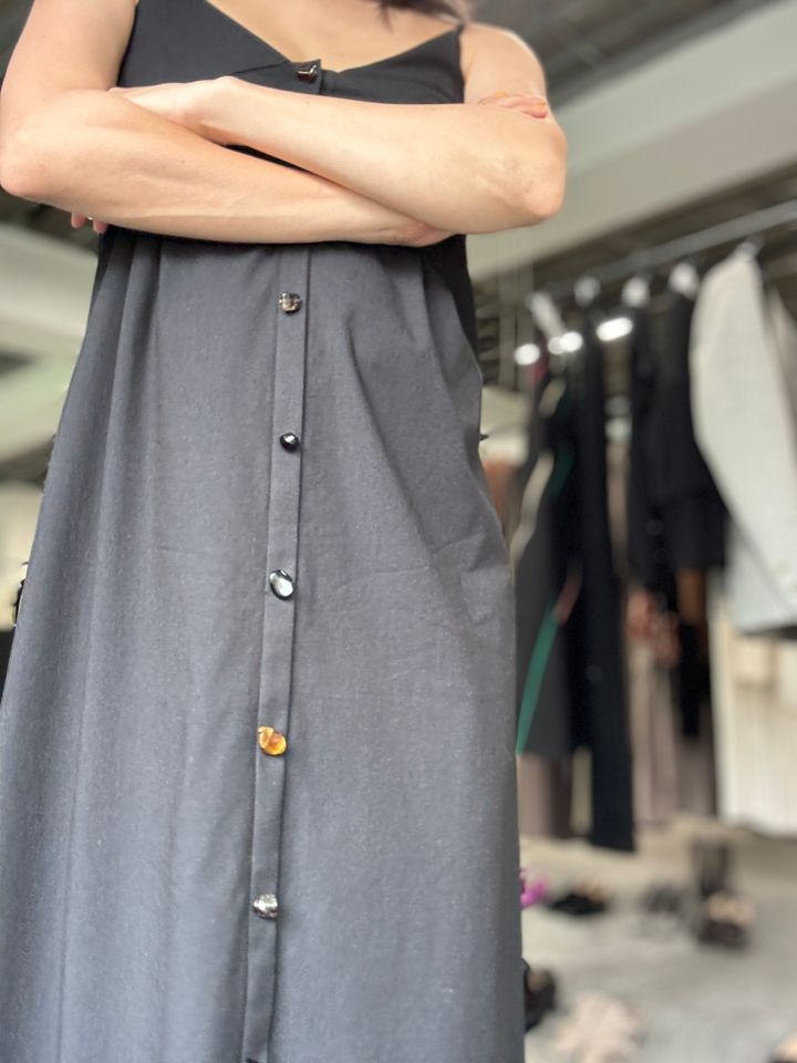 「今シーズンのテーマである『習作の美』は、19世紀半ばに活躍した印象派の画家たちが習作(練習のための作品や下絵)に美しさを見出したことに着想を得たもので、ボタンとして使用した天然石はあえて不揃いのまま、自然なままの状態に美しさを見出す女性の姿勢を表現。リラックスした空気感と今季のテーマを纏った、からだが泳ぐ涼しげなドレスです」ドレス¥64,900(アキラナカ/ハルミ ショールーム)