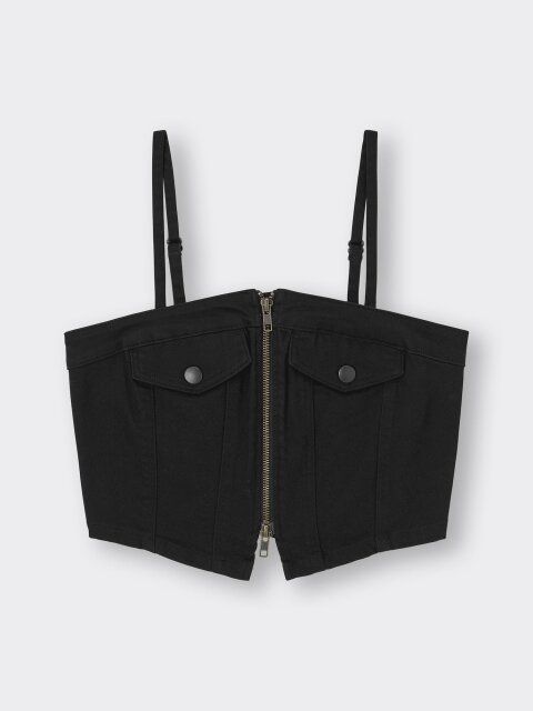 胸元のフラップデザインとフロントジップが特徴のビスチェ。ファスナー位置を調整して、スリット風に着こなしたアレンジもおしゃれ◎体にフィットする後ろゴムギャザー仕様で着心地もラクチンです。肩ひもの長さは調整可能で、取り外しもできるのでスタイリングの幅が広がります。