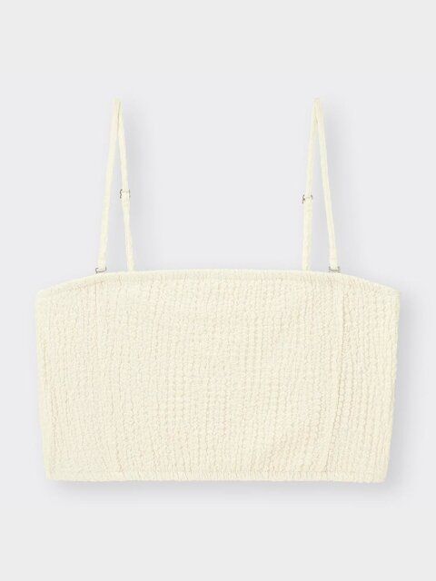 ポコポコした表面感のある素材が特徴のベアキャミソール。ストラップは長さ調節が可能で、取り外してベアトップとしてもさまざまなスタイリングに着回せます。フロント部分が2重仕立てなのでボディラインを拾いにくいのも嬉しいポイントです。