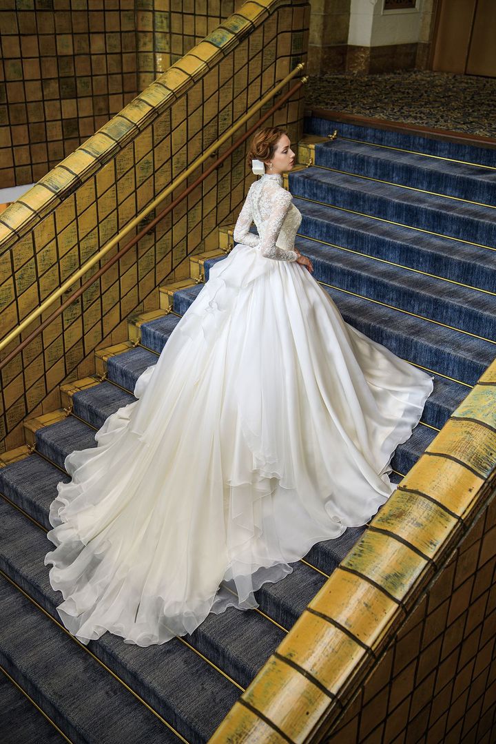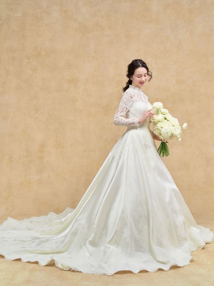 レースのスタンドカラー、ロングスリーブは上品でクラシカルな雰囲気。ミカド素材の光沢が美しいスカートにもレースをあしらい、印象的な後ろ姿を演出します。ドレス レンタル料¥352,000(ブライダリウム ミュー 本店 tel.03-5798-2611)