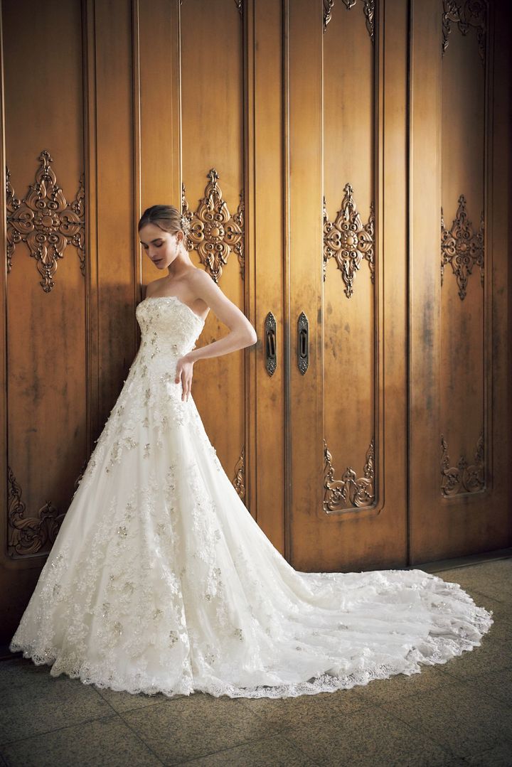 ベアトップのAラインドレスは王道人気のシルエット。繊細なレースにシルバーやクリスタルのビーディングが施され、花嫁が動くたびにきらきらと輝いて、洗練された華やかさを演出します。ドレス レンタル料¥495,000(メゾン ド フォーシス表参道本店 tel. 03-3400-0055)