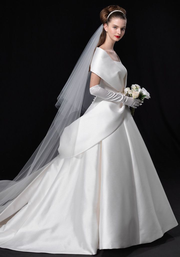 上品な光沢を楽しめるミカド素材だけを使用した贅沢な一着。モノマテリアルの潔い美しさとモダンなデザイン性が花嫁を包みます。ドレス¥935,000(エマリーエ/エマリーエ ウエディングドレスサロン tel.03-6804-3090)