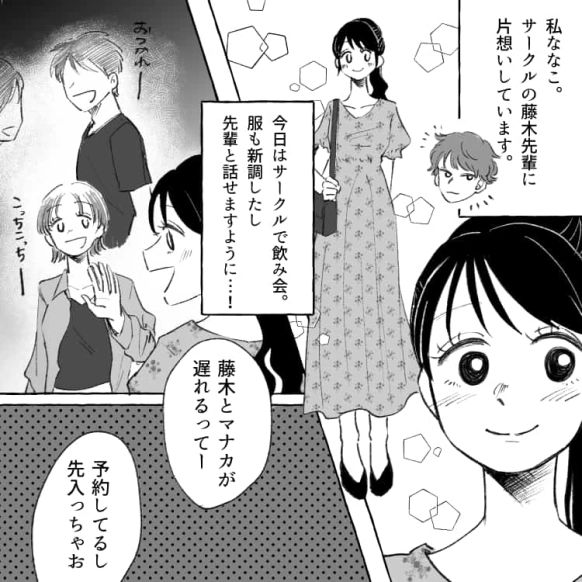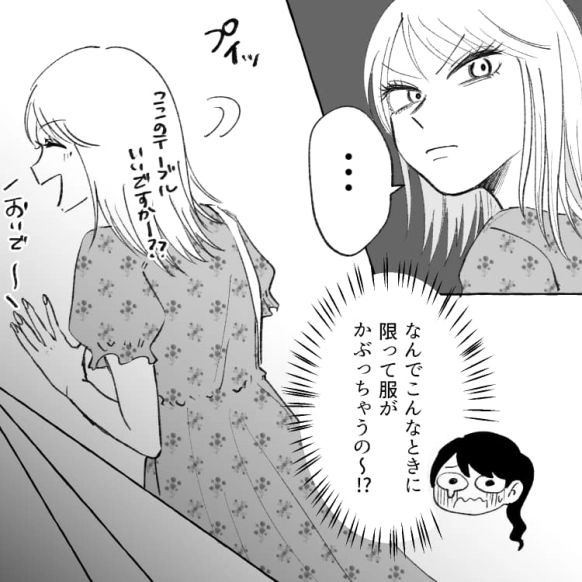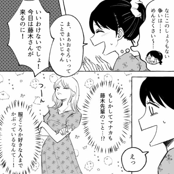服も新調し、気合を入れてサークルの飲み会に参加した主人公でしたが、なんと同期のマナカが自分と同じ服を着ていて……?