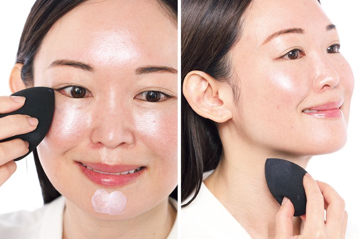両頰、鼻、額、顎に置いたらスポンジでポンポン伸ばすとガードしながら均一な肌に。内から外に広げることで光を集めて立体的に。最後に首との境目をぼかして。