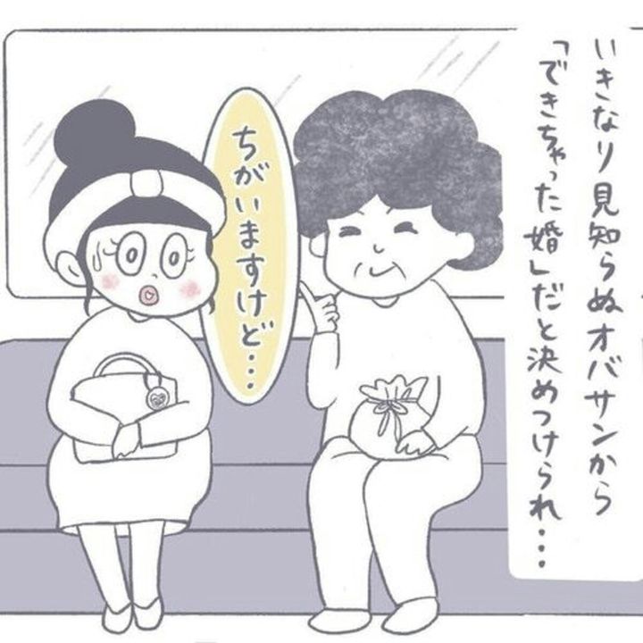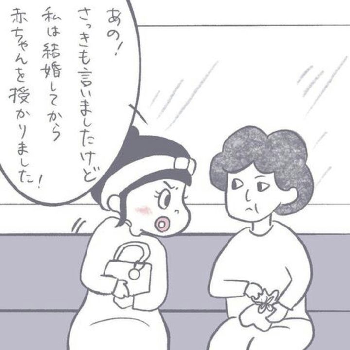 まるさんが一度否定しても止まらず、どんどんと失礼な言葉を投げかける女性。まるさんを見下す言葉ばかりではなく、女性の子どもたちが結婚したのち出産してどんなに祝福されたか、最近の若い子が授かり婚率が高いことなど、まるさんに関係がないことまで話し始めます。