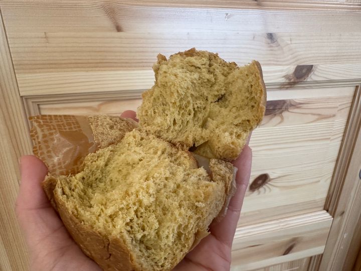 パンを割ってみるとこんな感じ!いちごが生地に練り込まれていました♪味はイチゴ牛乳の様な感じだと思いました。