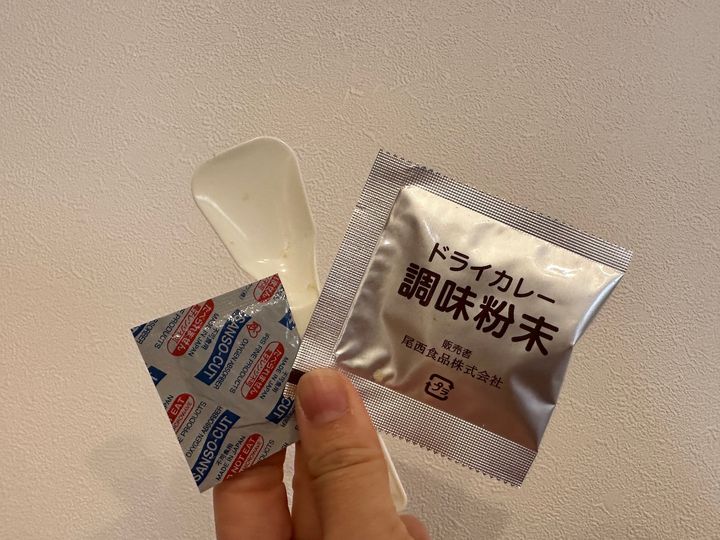 五目ごはんにはスプーンと乾燥剤。ドライカレーにはドライカレーの粉と乾燥剤、スプーンが付いていました!