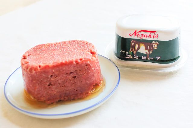 牛肉の缶詰として販売されているコンビーフ。中身は赤くて生肉っぽく見えますが…。実は塩漬けした牛肉を蒸し煮にし、細かくほぐして味付けしたものとか。それを缶やプラスチック容器に充填しているそう。