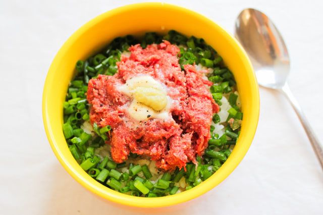 2.  温かいご飯にほぐした1のコンビーフ、バター、青ねぎ、黒こしょう、わさびを乗せ、めんつゆをかけます。