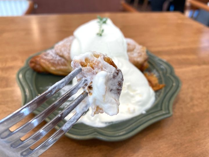 「クルッキー」のまず注目すべきポイントは見た目。とろーりとした生クリーム、粉砂糖がかけられていて、その上にはタイムが添えられています。届いた瞬間にキュンとしてしまうほどのビジュアルです。
