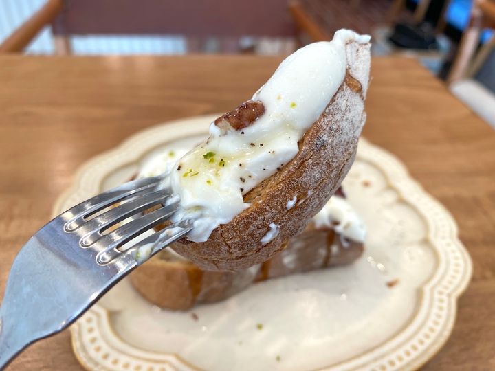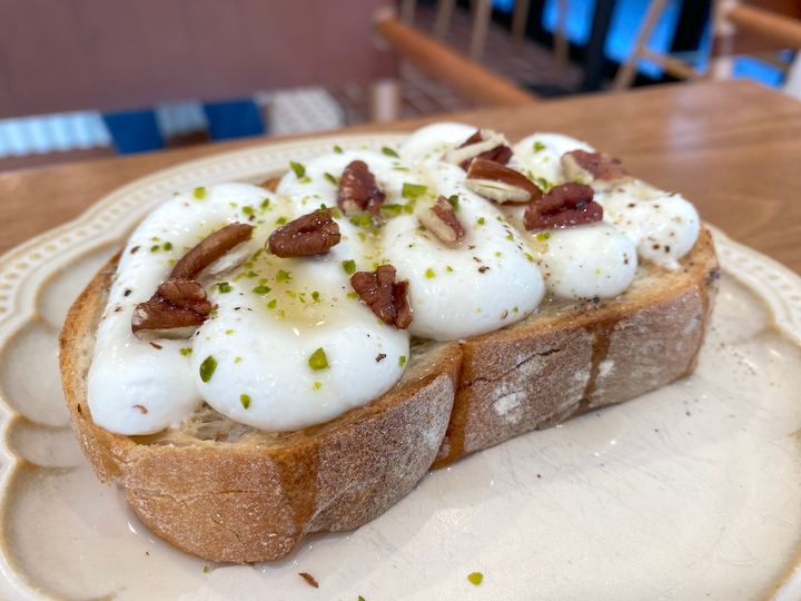 甘じょっぱいもの好きにおすすめしたいのが「ハニーリコッタトースト」。ライ麦パンにホイップ状にしたリコッタチーズ、ハチミツ、ピーカンナッツ、ピスタチオをトッピングして塩コショウで味をととのえた1品です。