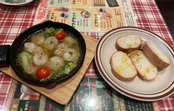 美味しかったので、もう少し食べたくなりアヒージョも注文。 アヒージョはきのことエビの2種類があり、エビを注文しました。 熱々でガーリックが香ばしく、食が進みます。 500円前後でドリンクメニューもたくさんあります。