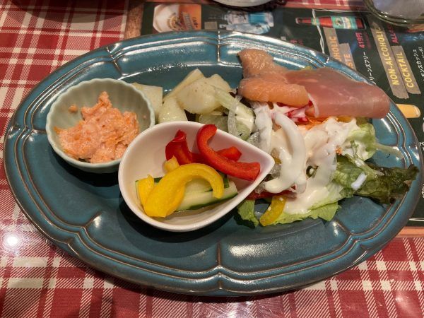 先ずは、本日限定盛り合わせ。 ピクルス、生ハム・サーモンのサラダ、明太和えなどなど。 日替わりでメニューも変わり、これだけでもお腹が膨れます。