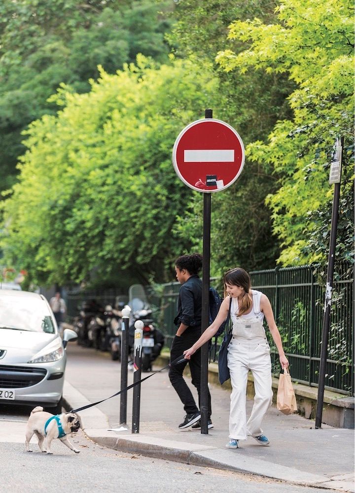 真っ白なデニムのオーバーオールに白のタンクトップ。同系色ながらも、微妙に異なる色のニュアンスが着こなしに奥行きをもたらす。スニーカーと愛犬のハーネスを同じ青で揃えた、小粋なお散歩スタイル。