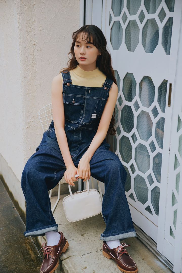 ワークウェアブランド《PAYDAY》のオーバーオールは、背面のサスペンダーが他と異なる個性が光る。機能性のあるデザインで、ともすれば男の子ぽく仕上がってしまうのだが、タートルネックのタンクトップを入れて、レディに着こなすのが気分。小物はシックな色にすることで、レモンイエローが良い塩梅の差し色となる。