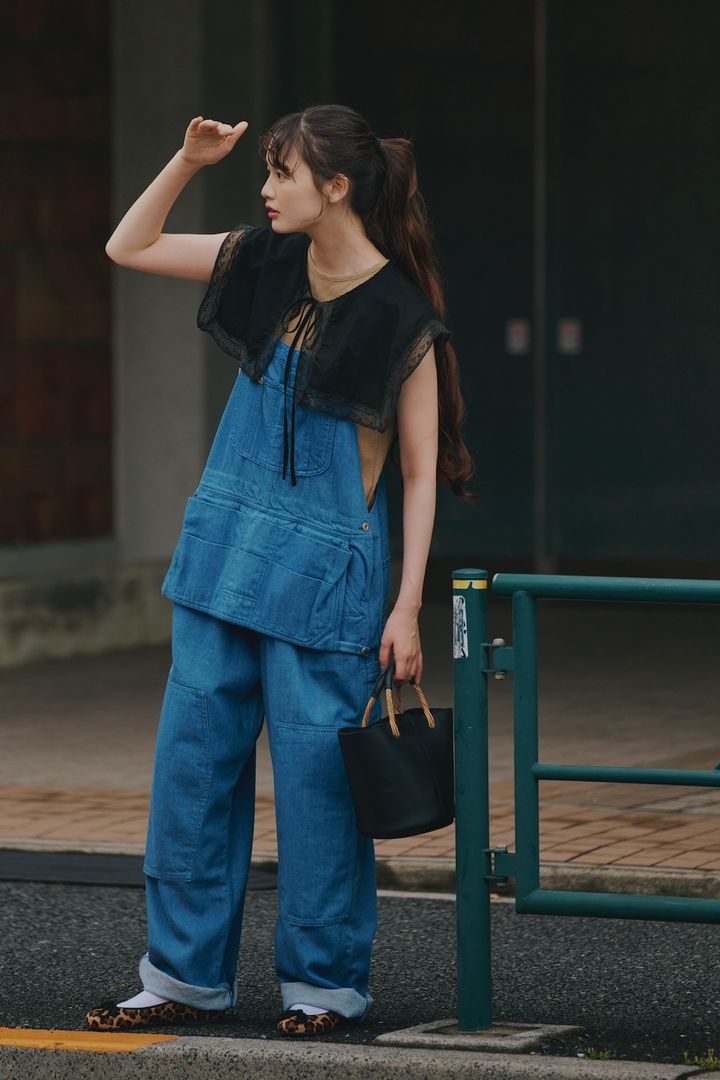 夏の定番、タンクトップ。本日はタフなイメージのオーバーオールに、レースのつけ襟を重ねてアレンジ。甘めのレースでも、黒ならば良い感じにコーディネートを引き締めてくれる。思わず見せたくなる後ろ姿にも注目。足下は、レオパードのフラットシューズで外して楽しもう。