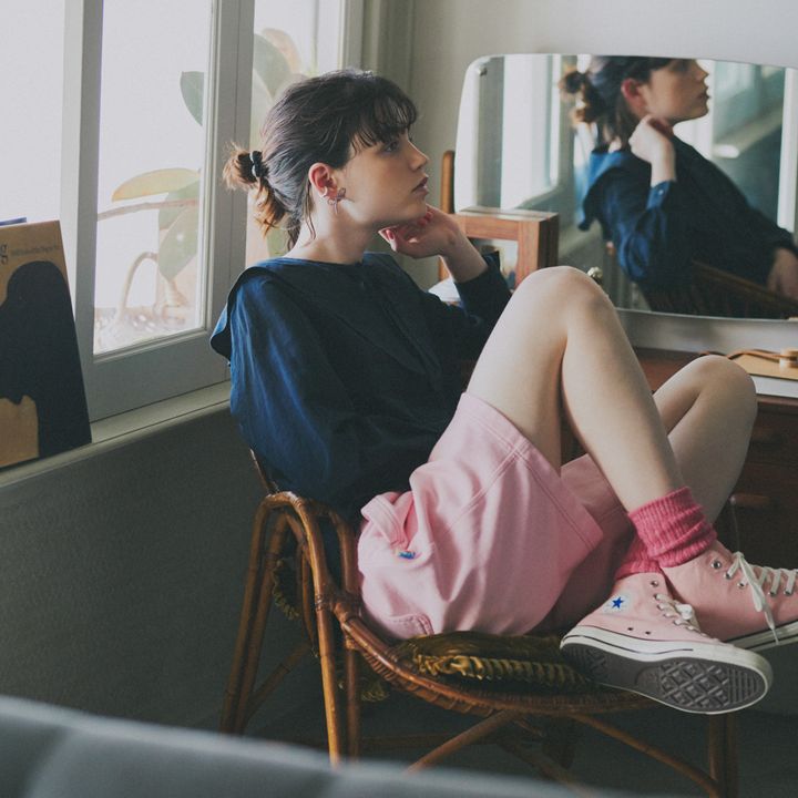 ハンサムなスウェットショートパンツスタイルに、ピンクのキュートさとリンクさせた、ガーリーなアクセを3点づけ。ヘアゴム、イヤーカフにピアスで愛嬌もプラスできる。