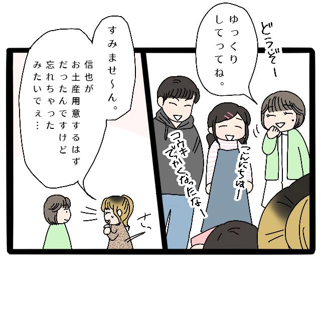 「すみませ~ん。信也がお土産用意するはずだったんですけど、忘れちゃったみたいでぇ・・」
