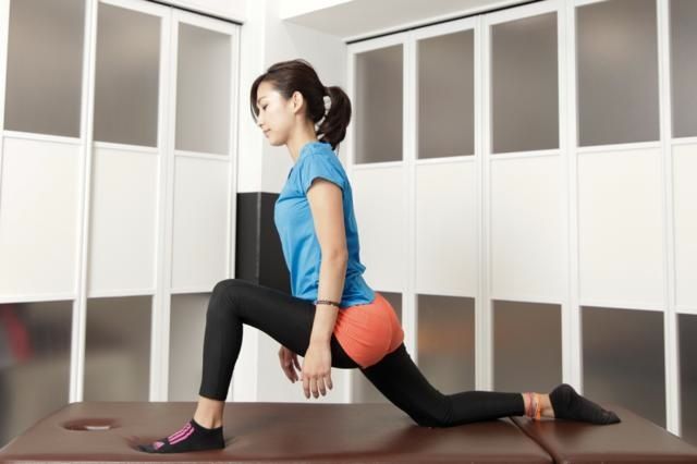 (1)床にひざ立ちして片脚を前方に出し、もう片方の脚を後方に下げる