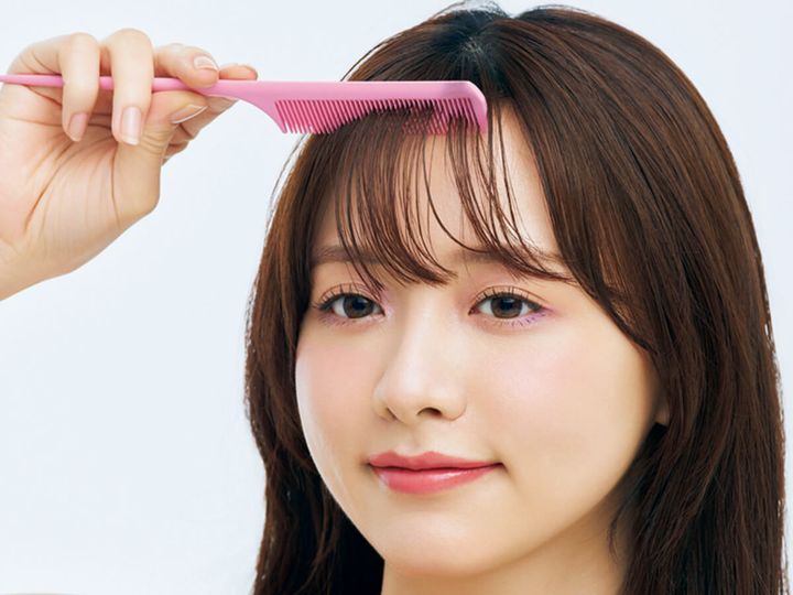 前髪の根元のクセをとるために、クシに水をつけ、ぬらしたクシで前髪をとかす。クセが取れればOKなのでぬらすのは根元だけ。