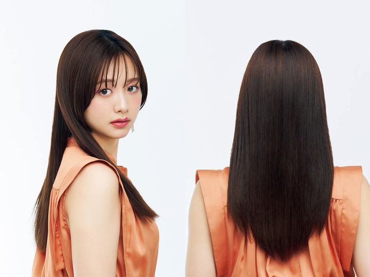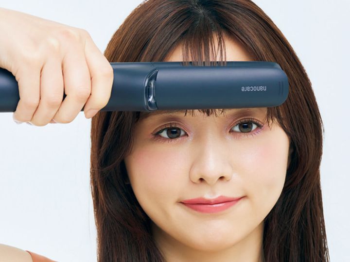 前髪はぬらしてブローし、上下2段でストレートアイロンをかけたらオイルでコーティング。水分を閉じ込め、湿気を吸わないようにしつつボリュームを抑えてツヤツヤな仕上がりに。