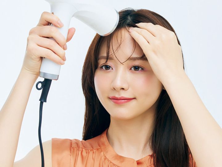 指先を根本に当てて左右に動かしながら、①でぬらした前髪の根本を乾かす。こうするとうねりが取れて前髪がストンと垂れ下がる。