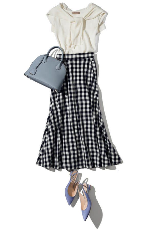 オフィスではきちんと感演出に役立つアンサンブル。今の時期は白をトップスに持ってきた、清潔感あるモノトーンが好印象。ギンガムスカートでトレンド感を出せば褒められ確実♡
