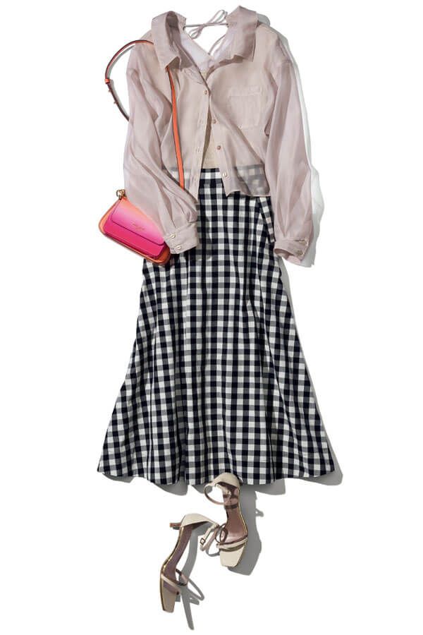 タンクがセットのシアーシャツは、インナーに気を使わず着られて忙しい朝の時短に♪ ギンガム柄スカートで黒をぶつければ、レディライクながらも甘すぎず好印象。
