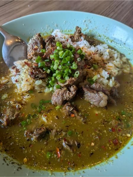 出汁の旨味とスパイスの調和がなんとも言えない組み合わせの妙で、辛いのにスプーンが止まりません!やわらかく煮込まれたお肉もゴロゴロ入っています。 テーブルに置いてあるショウガを入れると、また味わいが変化しておいしさも増しますよ。