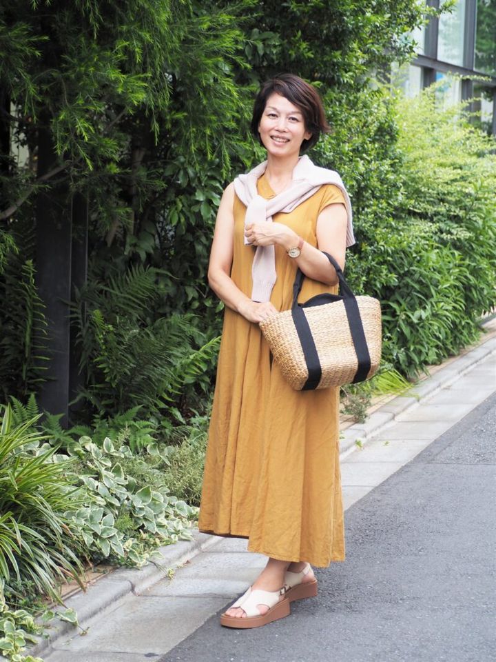 夏の装いにふさわしいアイテムといえば、かごバッグ。「カジュアルなコーディネートとの相性がよく、かなりの頻度で愛用中。ワンピースに合わせてバッグとサンダルは同系色でまとめました」