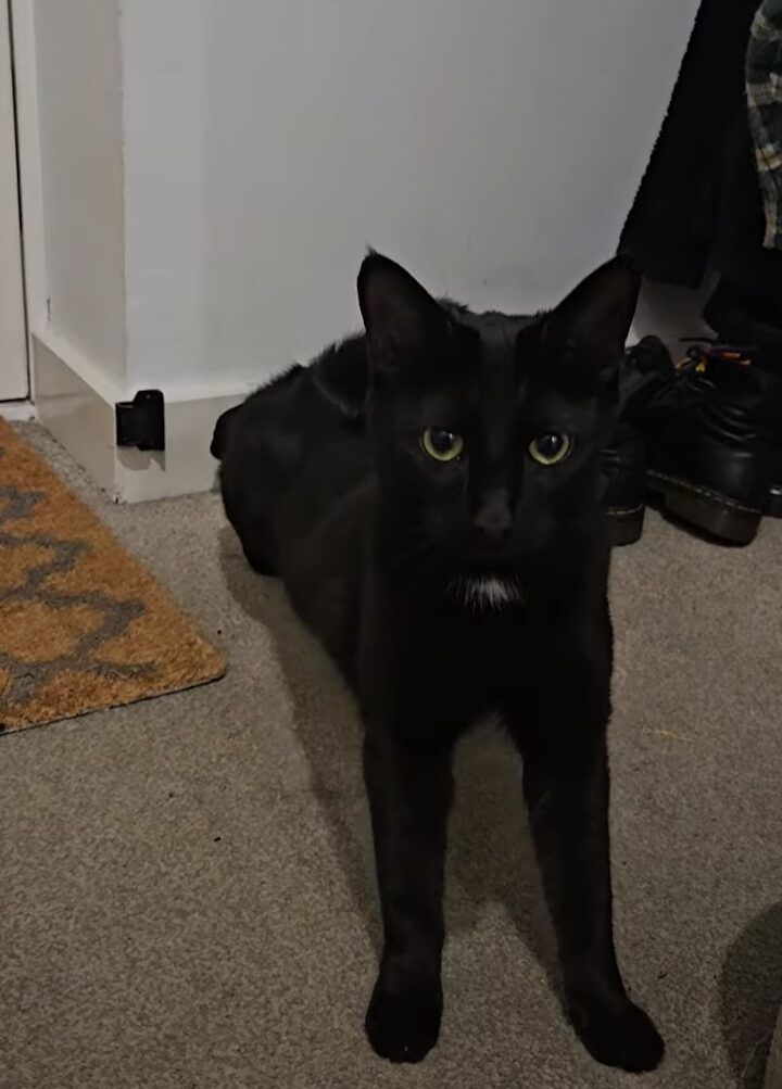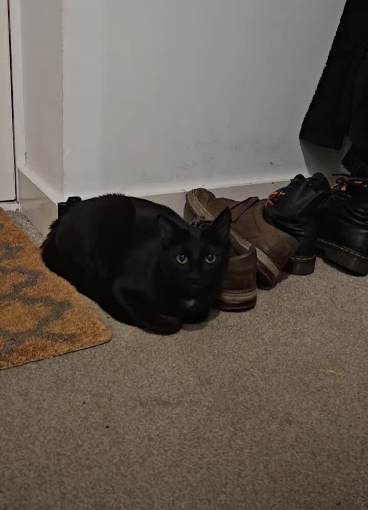 玄関の靴にまぎれていた黒猫。 その姿は、こちらの動画からご覧いただけます。