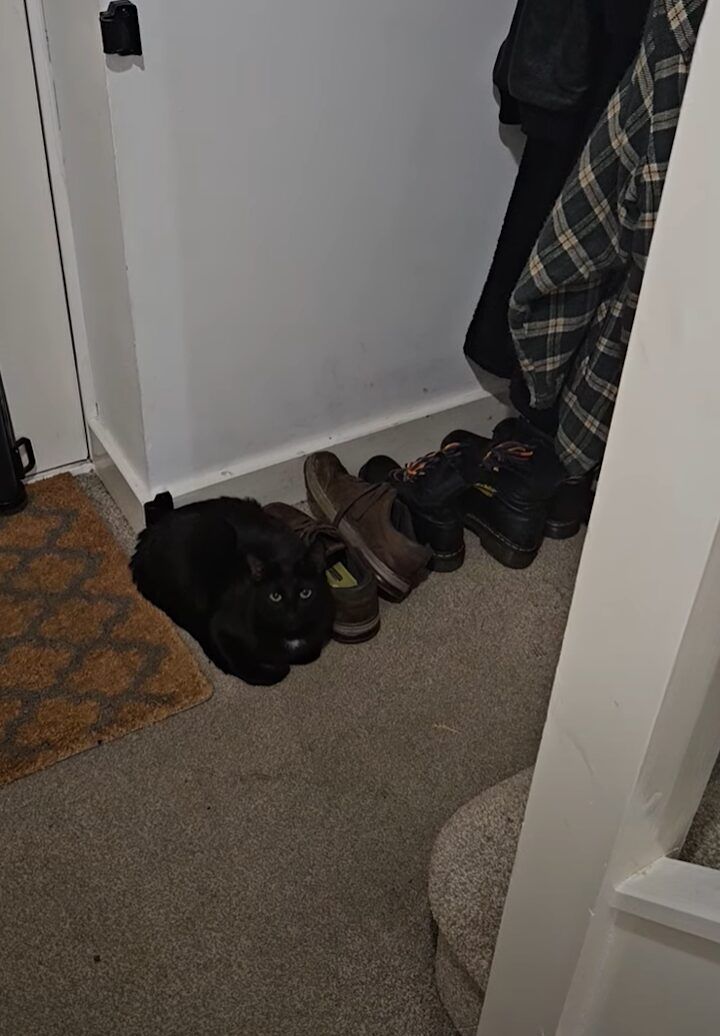 玄関でかくれんぼ?並べられた靴にひっそり黒猫が!!【海外・動画】