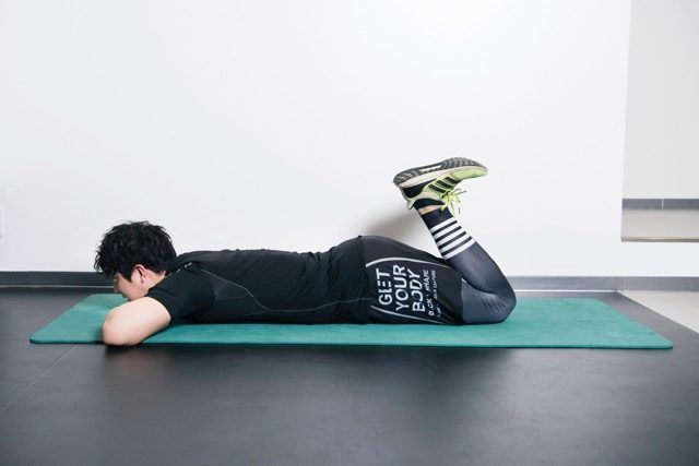 (2)片方の脚のひざを曲げてかかとを5秒程かけてゆっくりお尻に寄せていき、寄せきったところで2秒程キープして元の位置に戻す