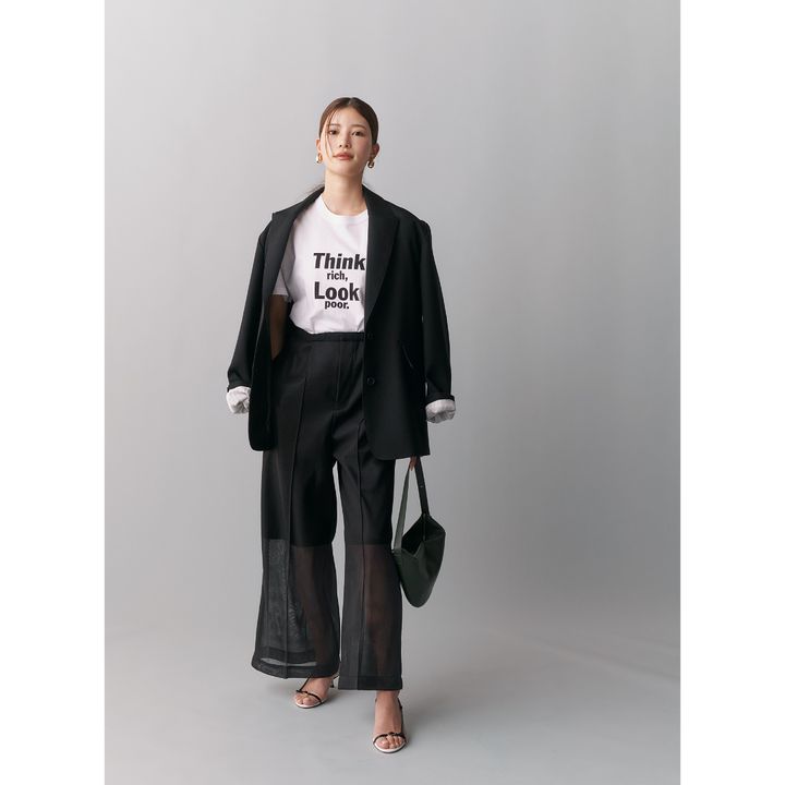 シアーパンツで春夏の黒ジャケットコーデが軽やかに