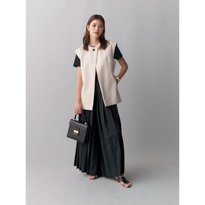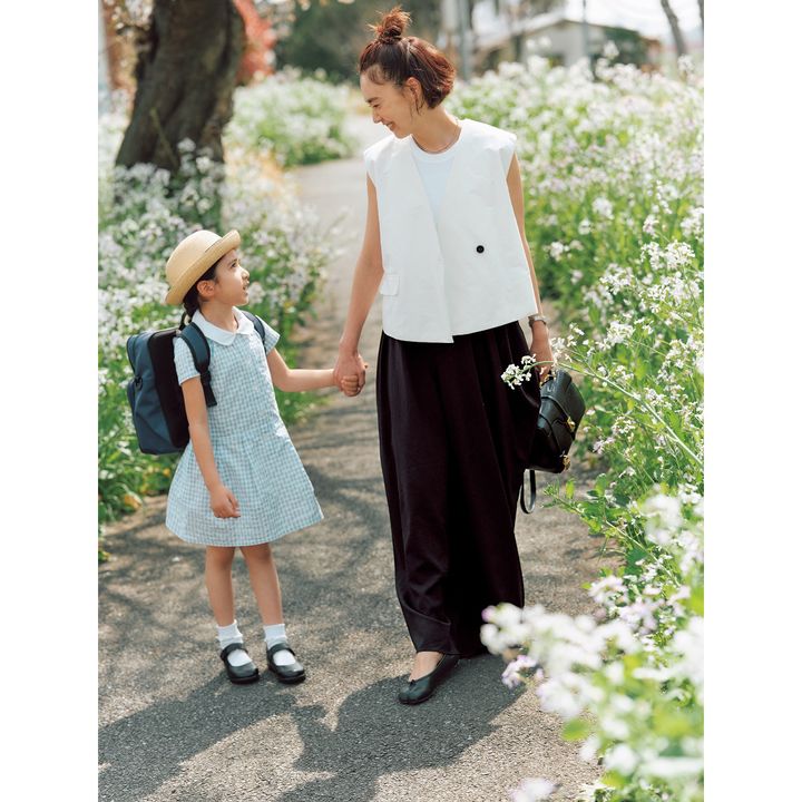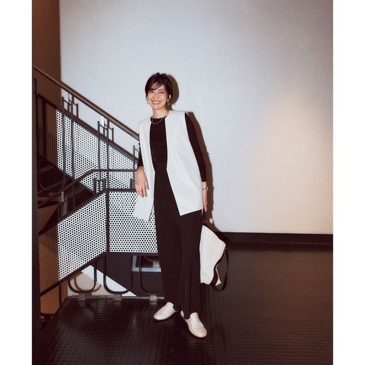白いジレに黒ボタンがアクセント。首元のみ閉じて着るとAライン風になり、バランスが取りやすい。ジレはオスロー、Tシャツはル コットン、パンツはハイク、バッグはセルジオ ロッシ、サンダルはペリーコのもの。