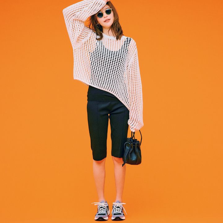 ざっくり編みのメッシュニット。ズルッとしたシルエットで、体型カバーをしながら肌見せが叶います。ニットはハイク、パンツはイウエン マトフ、バッグはノマディス、スニーカーはアシックスのもの。