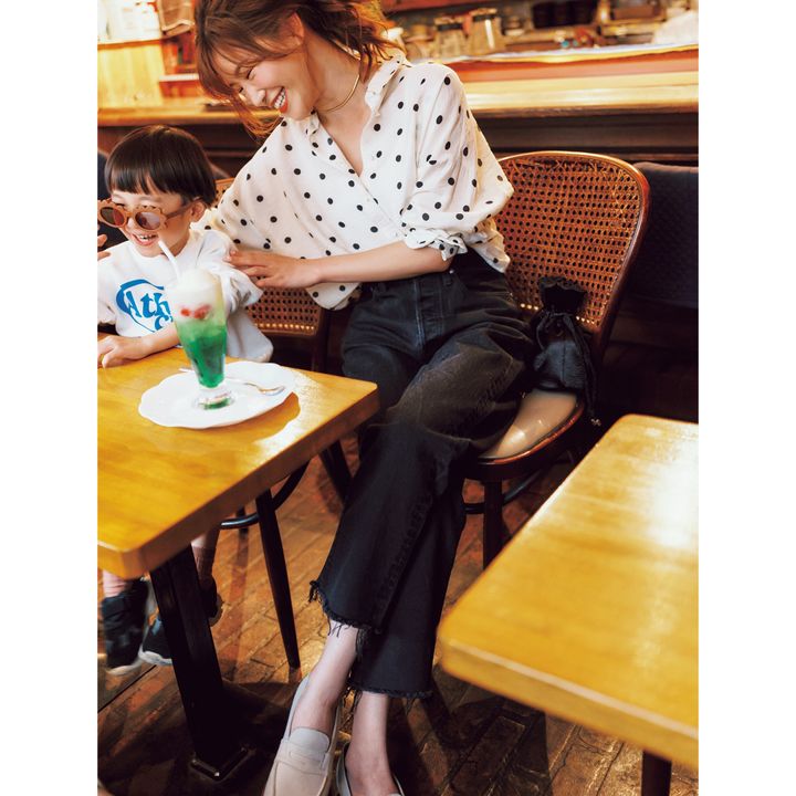 ドットブラウスに黒デニムを合わせた甘辛スタイル。ツヤのあるブラウスにはデニムやチノパンのような、しっかりした素材のボトムを合わせるとほどよいラフさが出せてバランスが取りやすくなります。シャツはザラ、デニムはハイクのもの。
