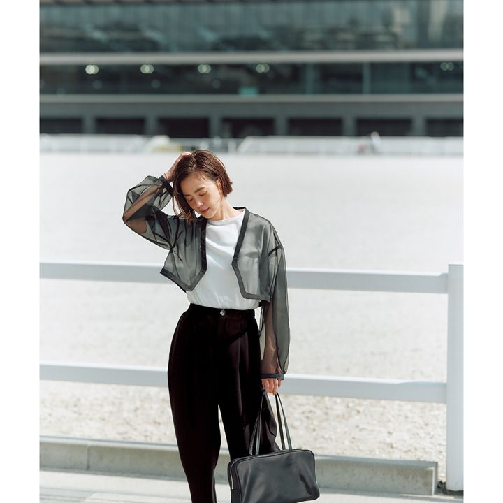 シアー素材のショート丈ジャケットはこれからの時期に軽やかな羽織りものとして活躍しそう。ミニマムコーデが華やかになり、冷房対策にもなります。ジャケットとTシャツはイウエン マトフ、パンツはエンフォルド、バッグはトゥティエのもの。