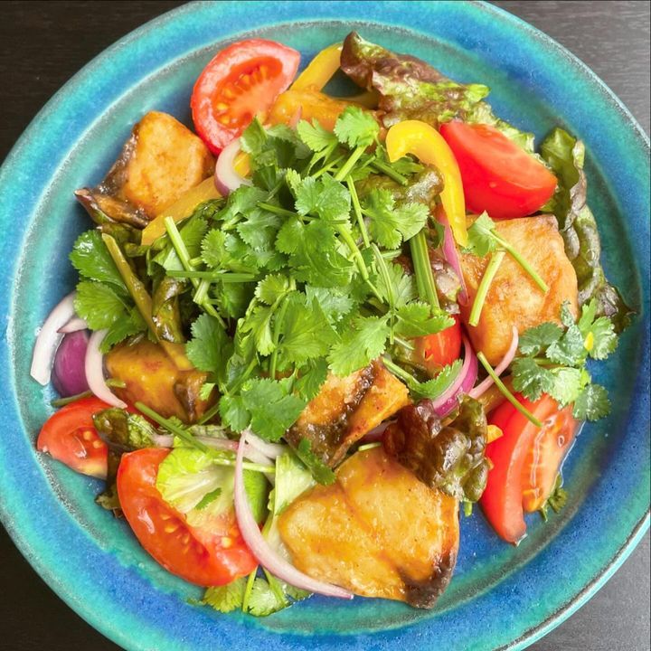 カリッと揚げたぶりにサニーレタスやトマト、紫玉ねぎなどを合わせて、ナンプラー香るドレッシングをまとわせ、仕上げにパクチーをたっぷりと。
