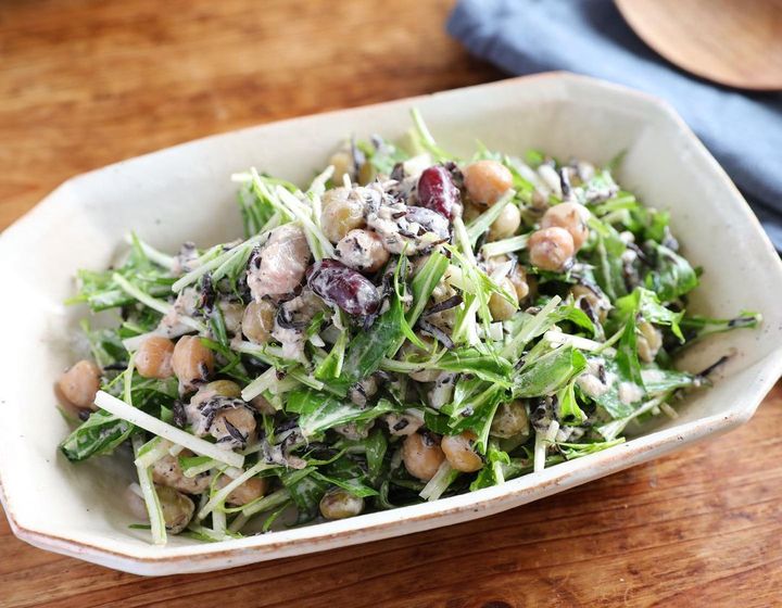 ひじきや練りからしもプラスして和風仕立てに。シャキシャキの水菜が豆サラダのおいしさをさらに引き立てます。