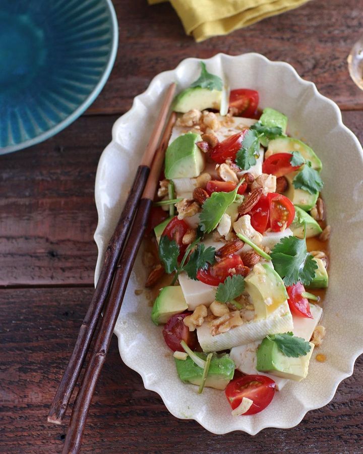 水気をよくきった豆腐に、アボカド、ミニトマト、砕いたナッツを合わせて。