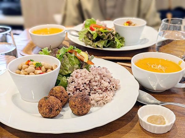 筆者が友人と訪れた時に選択した総菜の健美膳です。丸いボール状のものはコロッケです。衣は無しでカリっと香ばしく美味しかったです。お豆がたっぷりですが、さっぱりとした風味で、程良い豆の噛み応えがあり食べやすかったです。 そして、スープですがこの日は人参スープ。人参だけではなく、複数の素材がかくれていますが野菜臭さは全く無く、風味良く人参の優しい甘さが活かされて、とろり美味でした。