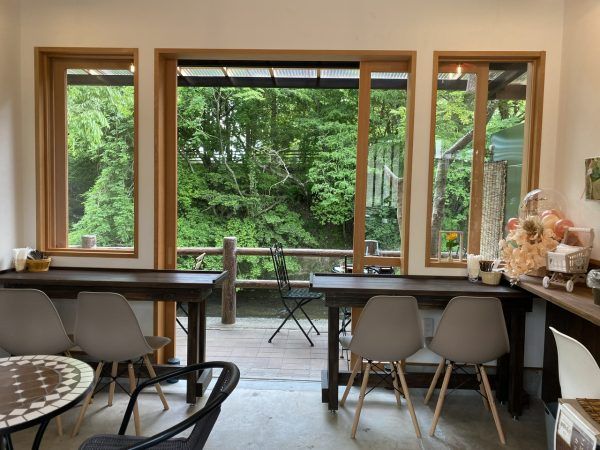 那須烏山の龍門の滝と、そこから流れる江川を眺められる緑に囲まれた「滝の茶屋ガパガポ商店」。