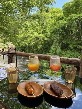 青空と美しい緑と川とパチリ!映えます!オレンジとレッドグレープフルーツのフルーツソーダです。お団子もソーダも美味しい。
