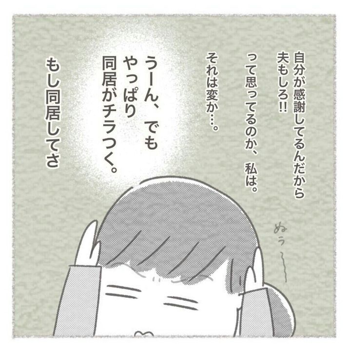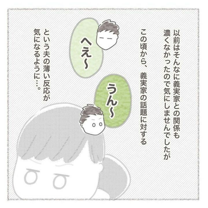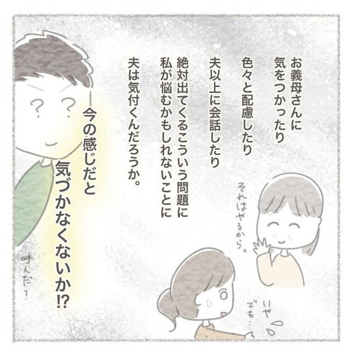 このころから、義実家の話題をしても夫の反応が薄いことを疑問に思ったペンコさん。もし今後同居をすることになっても、夫はペンコさんの苦労や配慮、悩みに気付かずにいるのではないかと思うようになります。