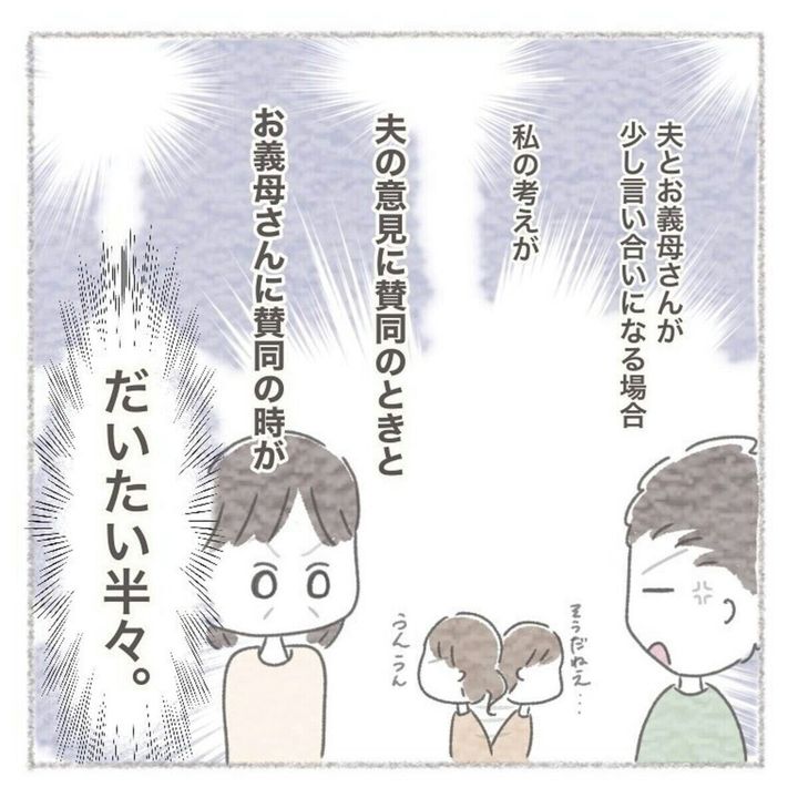 義母と夫が言い合いになる場面を何度か経験したペンコさん。同意を求めない夫に対して、同意を求めてくる義母の言葉はプレッシャーに感じます。今ですらそんな状態なのに、もし同居したら…と考えると、同居へのハードルが上がりますよね。