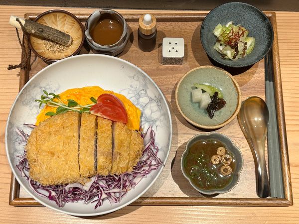 群馬のブランド豚「くちどけポーク」にパン粉をつけ、サクッと揚げたやわらかいカツとふわふわの半熟卵を合わせた丼ぶり。胡麻味噌だれ、柚子ポン酢、与那国黒潮源流塩などを合わせて食べます。目を奪われるほど大きなサイズのとんかつですが、衣はさくさく、お肉はやわらかくジューシーだから、ぺろっと食べられます。