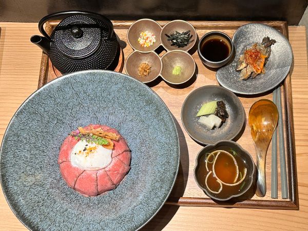 厳選されたA5黒毛和牛のイチボを低温で2時間火入れし、ガーリックバターソースの風味たっぷりのライスに乗せています。最初はそのまま味わってから、自家製オニオンソースや味噌やあられ、わさびなどで味変をしたり、ほうじ茶出汁をかけてお茶漬け風に食べるなど、一皿で何通りも楽しめる丼ぶりです。